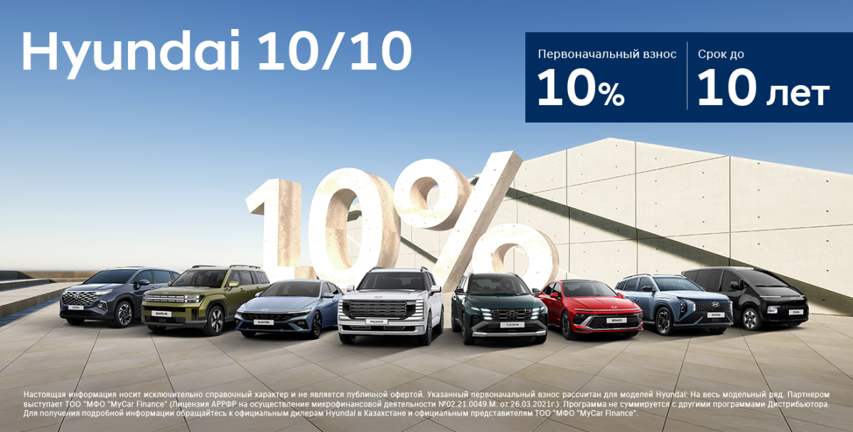 Оцените новый уровень доступности: всего 10% первоначального взноса — и вы уже за рулём нового Hyundai. Это идеальное сочетание выгодных условий, простоты оформления и легендарного качества, которое мы называем 10 из 10. Hyundai 10/10 — когда всё действительно на высшем уровне.
